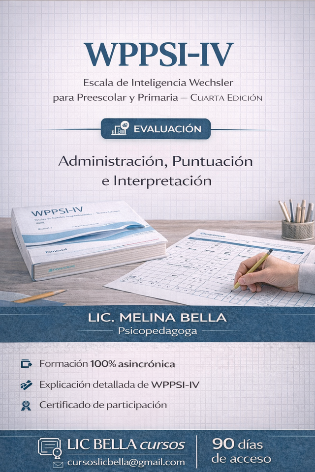 Formación asincrónica 100%. A traves de videos explicativos aprendé a administrar, puntuar e interpretar la escala de inteligencia más utilizada en niños pequeños: WPPSI IV.